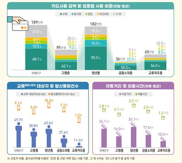 청년층(19~34세)은 85.8%가 근로자였고, 이 중 74%는 상시근로자였다. 한 달 평균 카드사용 실적은 181만9000원으로, 55%를 소매업종에서 사용했다. 한 달간 모바일 교류 대상자는 43.6명으로 하루 10.3회 발신 통화를 했다. 출퇴근과 나들이를 포함하면 하루 26.1㎞ 이동했고, 집·직장이 아닌 곳으로 3.3시간 외출했다.