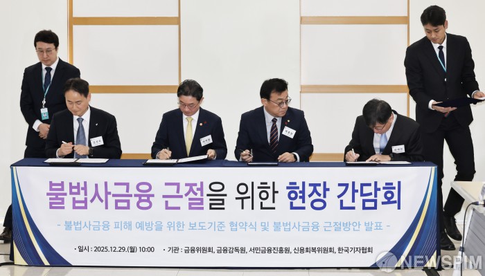 [서울=뉴스핌] 양윤모 기자 = 이억원 금융위원장이 29일 오전 서울 동작구 서울금융복지상담센터 동작센터에서 개최된 불법사금융 근절 현장 간담회에 참석해 협약서에 서명하고 있다. 왼쪽부터 김성욱 금융감독원 부원장보, 이억원 금융위원장, 박종현 한국기자협회장, 이재연 서민금융진흥원장. 정부는 불법사금융예방대출 금리 부담을 현행 15.9%에서 5~6%로 대폭 인하해 서민·취약계층이 불법사금융을 찾지 않도록 정책서민금융 지원을 강화할 계획이다. 2025.12.29 yym58@newspim.com