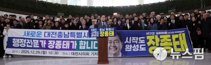 29일 장종태 의원은 대전시의회 로비에서 출마 기자회견을 열고 지지자 180여명과 함께 '대전·충남 통합'에 환영의 뜻을 밝히며 '행정전문가'의 면모를 토대로 수도권 일극 체제의 둑을 허무는 결단을 내리겠다고 강조했다.