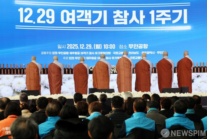 [서울=뉴스핌] 29일 오전 전남 무안국제공항에서 열린 12.29 제주항공 여객기 참사 1주기 추모식이 김민석 국무총리 등이 참석한 가운데 개최되고 있다. [사진공동취재단] 2025.12.29 photo@newspim.com