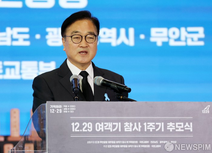 [서울=뉴스핌] 사진공동취재단 = 우원식 국회의장이 29일 오전 전남 무안군 무안국제공항에서 열린 '12.29 제주항공 여객기 참사 1주기 추모식'에서 추모사를 하고 있다. 2025.12.29 photo@newspim.com
