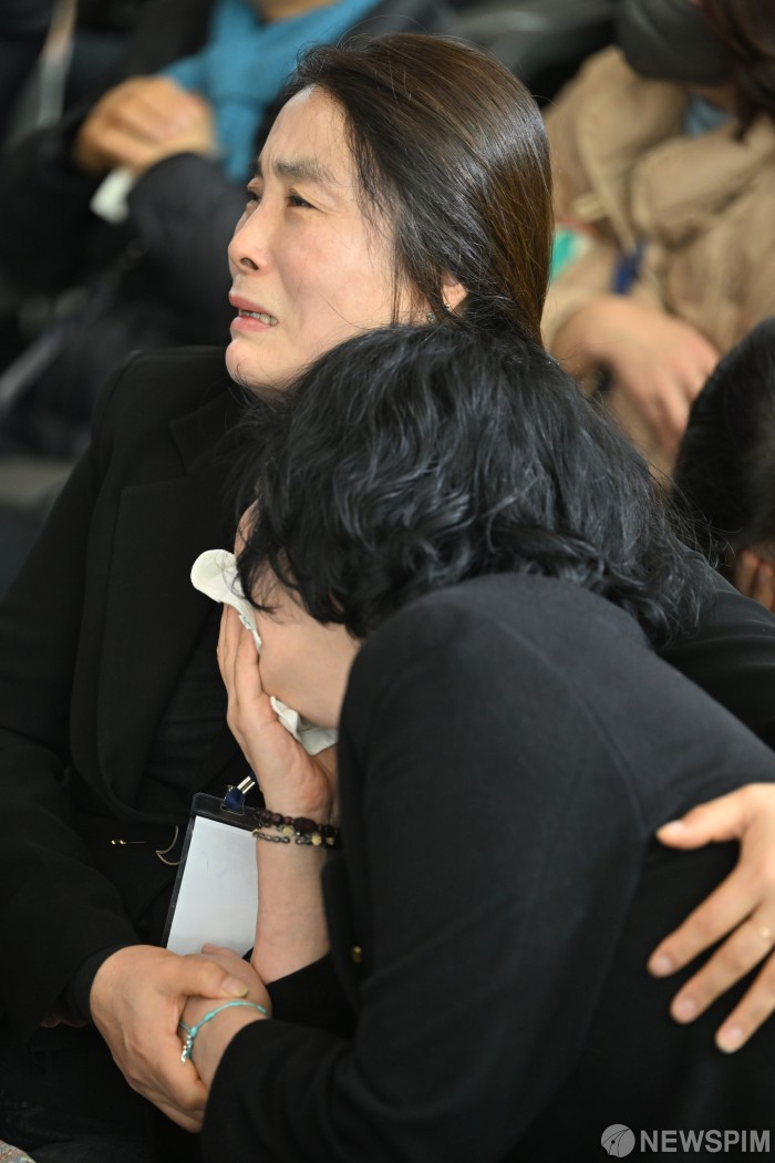 [서울=뉴스핌] 사진공동취재단 = 12·29 제주항공 여객기 참사 1주기인 29일 오전 전남 무안국제공항에서 열린 참사 1주기 추모식에 참석한 유가족들이 눈물을 닦고 있다. 2025.12.29 photo@newspim.com