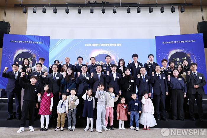 [서울=뉴스핌] 윤호중 행정안전부 장관이 29일 오전 세종컨벤션센터에서 국민 안전을 위해 헌신한 공직자와 안전실천의인 등과 함께 열린 '2025 대한민국 안전동행 한마음' 행사에서 재난안전유공 수상자들과 기념촬영을 하고 있다. [사진=행정안전부] 2025.12.29 photo@newspim.com