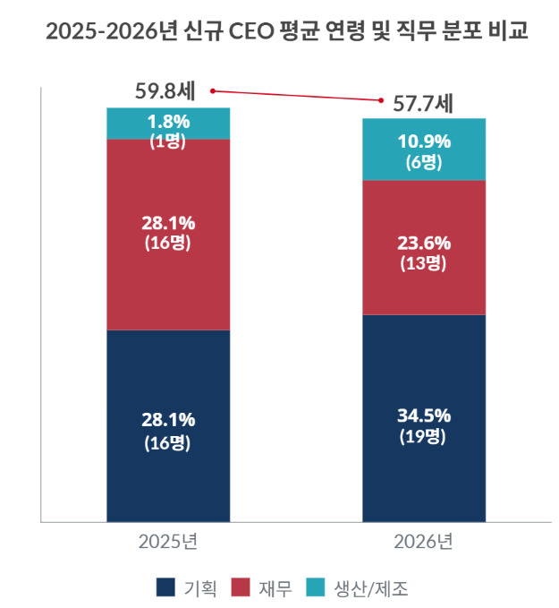 직무 전문성에서도 변화가 감지됐다. 재무 출신 CEO 비중은 28.1%(16명)에서 23.6%(13명)로 낮아진 반면, 생산·제조 부문 출신은 1.8%(1명)에서 10.9%(6명)로 크게 늘어났다.