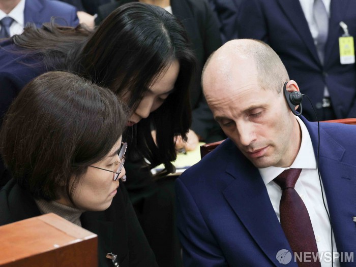 [서울=뉴스핌] 윤창빈 기자 = 해롤드 로저스 쿠팡 임시 대표가 30일 서울 여의도 국회 과학기술정보방송통신위원회 전체회의에서 열린쿠팡 침해사고 및 개인정보 유출, 불공정 거래, 노동환경 실태 파악과 재발방지 대책 마련을 위한 청문회에서 관계자들과 대화하고 있다. 2025.12.30 pangbin@newspim.com