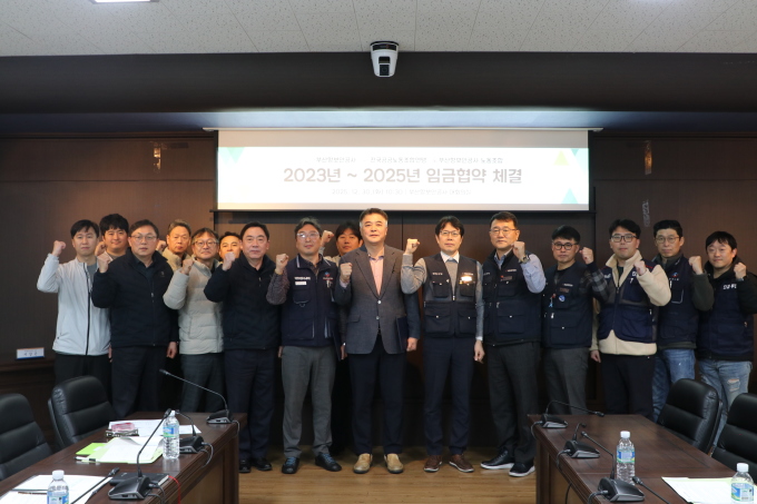 부산항보안공사 노동조합과 사용자 측이 30일 오전 10시30분 대회의실에서 임금협약을 계결한 뒤 기념사진을 찍고 있다.[사진=부산항보안공사 노동조합] 2025.12.30