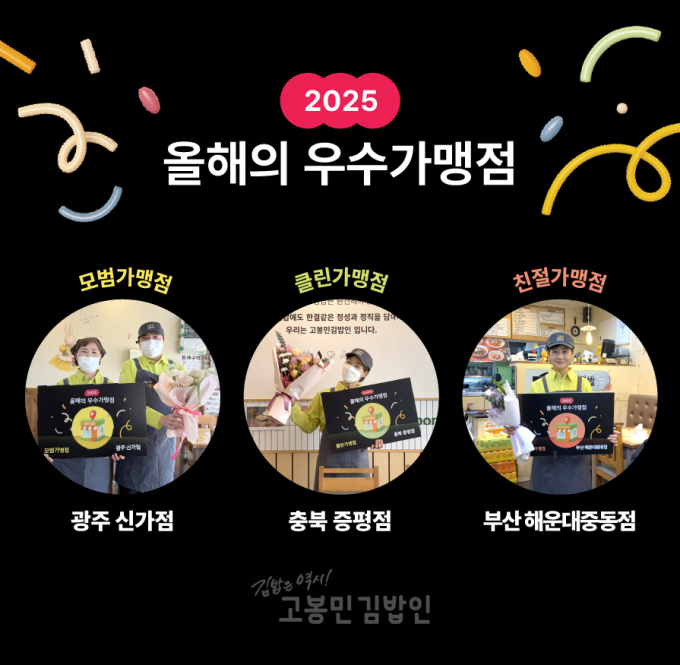 고봉민김밥인 관계자는 "선정된 우수 가맹점에 축하의 마음을 전하며, 앞으로도 가맹점과 본사가 서로 신뢰하고 협력하며 함께 성장할 수 있도록 최선을 다하겠다."라고 밝혔다. 더불어 "브랜드의 얼굴이 되어 현장에서 고객과 만나고 있는 모든 가맹점주님께도 깊은 감사를 드린다."라고 전했다.