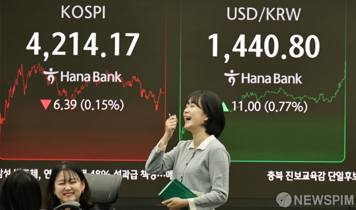 [서울=뉴스핌] 양윤모 기자 = 2025년 증시폐장일인 30일 오후 코스피가 전장 종가보다 6.39 포인트(0.15%) 하락하며 4214.17로, 코스닥은 7.12 포인트(0.76%) 하락한 925.47로 장을 마감한 가운데, 서울 중구 하나은행 딜링룸에서 직원들이 업무를 보고 있다. 서울외환시장에서 달러/원 환율은 전장 대비 11.00원 상승한 1440.80원에 주간거래를 마감했다. 2025.12.30 yym58@newspim.com