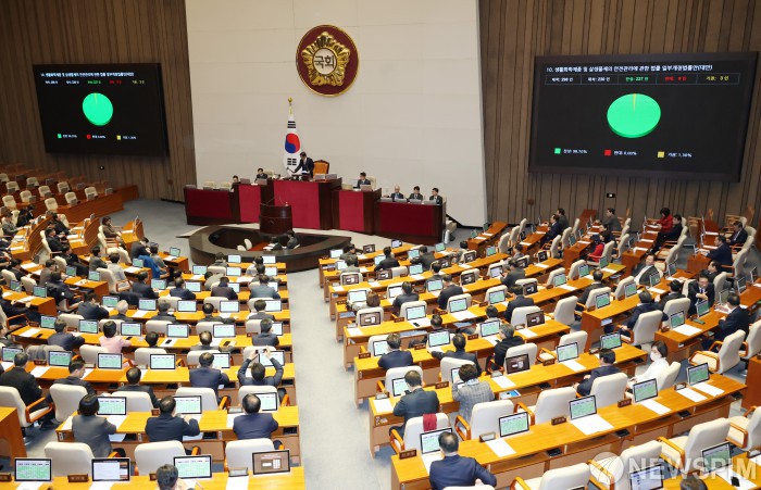 [서울=뉴스핌] 정일구 기자 = 30일 오후 서울 여의도 국회에서 열린 본회의에서 생활화학제품 및 살생물제의 안전관리에 관한 법률 일부개정법률안(대안)이 가결되고 있다. 2025.12.30 mironj19@newspim.com