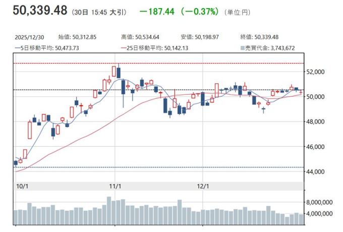 올해 들어 주가가 큰 폭으로 상승해 온 가운데, 전날 미국 증시 하락의 영향을 받아 이익 확정과 보유 포지션 정리를 위한 매도가 우세했다. 다만 하방 경직성을 의식한 매수도 유입되면서 주가는 상승세로 전환하는 장면도 있었다. 연말 기준으로는 사상 처음으로 5만 엔 선에서 마감했다.
