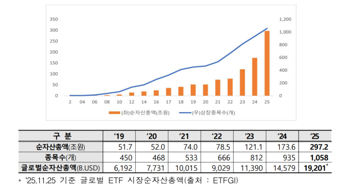 30일 한국거래소가 발표한 '2025년 ETF·ETN 시장 결산 및 주요 특징 분석'에 따르면 지난달 25일 기준 국내 ETF 시장의 순자산총액은 297조2000억원으로 전년 대비 71.2% 증가했다. 이는 글로벌 ETF 시장 성장률(31.7%)의 두 배를 넘는 수준이다. ETF 상장 종목 수는 1058개로 1년 새 123개 늘었다.