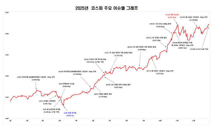 [서울=뉴스핌] 김가희 기자 = 올해 국내 증시가 정부의 자본시장 활성화 정책과 기업들의 주주가치 제고 노력에 힘입어 사상 처음으로 코스피 4000선을 돌파하며 기록적인 한 해를 보냈다. 코스닥 역시 500조원대 시가총액 시대를 열며 동반 성장했다.
