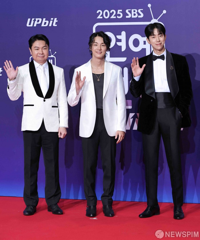 [서울=뉴스핌] 윤창빈 기자 = 예능 미운 우리 새끼X신발 벗고 돌싱포맨(왼쪽부터 임원희, 윤시윤, 윤현민) 출연진이 30일 서울 마포구 SBS프리즘타워에서 열린 2025 SBS 연예대상 포토월에서 포즈를 취하고 있다. 2025.12.30 pangbin@newspim.com