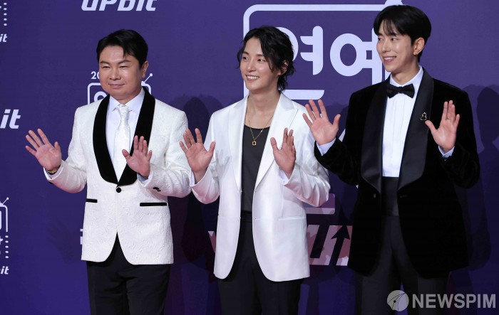 [서울=뉴스핌] 윤창빈 기자 = 예능 미운 우리 새끼X신발 벗고 돌싱포맨(왼쪽부터 임원희, 윤시윤, 윤현민) 출연진이 30일 서울 마포구 SBS프리즘타워에서 열린 2025 SBS 연예대상 포토월에서 포즈를 취하고 있다. 2025.12.30 pangbin@newspim.com