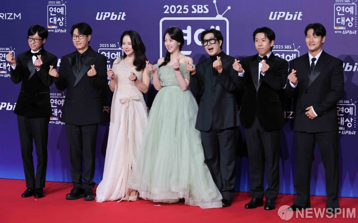 [서울=뉴스핌] 윤창빈 기자 = 예능 런닝맨(왼쪽부터 유재석, 지석진,송지효, 지예은, 하하, 양세찬, 김종국) 출연진이 30일 서울 마포구 SBS프리즘타워에서 열린 2025 SBS 연예대상 포토월에서 포즈를 취하고 있다. 2025.12.30 pangbin@newspim.com