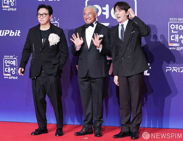 [서울=뉴스핌] 윤창빈 기자 = 예능 마이턴(왼쪽부터 탁재훈, 추성훈, 김원훈) 출연진이 30일 서울 마포구 SBS프리즘타워에서 열린 2025 SBS 연예대상 포토월에서 포즈를 취하고 있다. 2025.12.30 pangbin@newspim.com