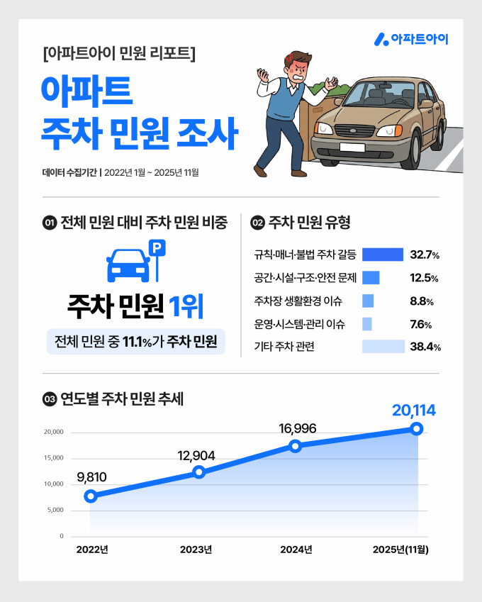 31일 생활지원 플랫폼 '아파트아이'가 2022년 1월부터 지난달부터 전국 아파트 관리사무소에 제출된 민원을 분석한 결과, 전체 공동주택 민원 약 55만건 중 약 11%가 주차 민원이라고 밝혔다. 4년 연속 민원 수 1위다.