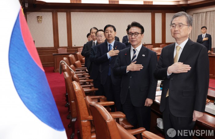 [서울=뉴스핌] 이길동 기자 = 김민석 국무총리가 31일 서울 종로구 정부서울청사에서 열린 임시 국무회의에서 국기에 경례하고 있다. 2025.12.31 gdlee@newspim.com