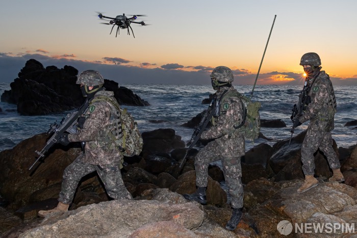 [삼척=뉴스핌] 류기찬 기자 = 26일 오전 강원 삼척시의 한 해안가에서 육군 제23경비여단 군 장병들이 경계용 드론을 이용한 수제선 정밀정찰 작전을 수행하고 있다. 경계용 드론은 군 장병들이 직접 접근하기 어려운 구역까지 하늘에서 살피며 빈틈없는 경계작전태세를 유지하는데 큰 도움을 주고 있다. 2025.12.26 ryuchan0925@newspim.com