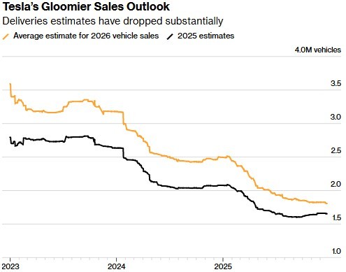 월가는 2026년 전망에 대해서도 마찬가지로 암울한 전망을 내놓고 있다. 2년 전 이맘때 애널리스트들은 테슬라가 300만대 이상을 인도할 것으로 예측했다. 올해 인도량에 대한 평균 추정치는 약 180만대로 급락했다.