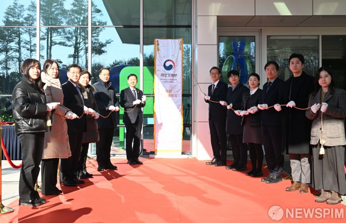 [서울=뉴스핌] 구윤철 부총리 겸 재정경제부 장관이 2일 정부세종청사에서 열린 재정경제부 출범식에서 참석자들과 함께 재정경제부 현판식을 하고 있다. [사진=재정경제부] 2026.01.02 photo@newspim.com