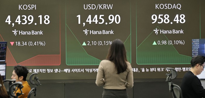 [서울=뉴스핌] 양윤모 기자 = 6일 오전 코스피가 전장 종가보다 18.39 포인트(0.41%) 하락하며 4439.18로, 코스닥은 0.98 포인트(0.10%) 상승한 958.48로 장을 시작한 가운데, 서울 중구 하나은행 딜링룸에서 직원들이 업무를 보고 있다. 서울외환시장에서 달러/원 환율은 전장 대비 2.10원 상승한 1445.90원에 주간거래를 시작했다. 2026.01.06 yym58@newspim.com