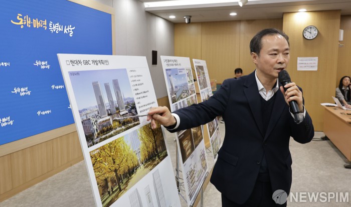 [서울=뉴스핌] 양윤모 기자 = 김창규 서울시 균형발전본부장이 6일 오전 서울시청 브리핑룸에서 현대차 GBC(글로벌 비즈니스 콤플렉스) 추가협상 결과를 발표하고 있다. 서울시는 현대자동차그룹과의 추가 협상을 통해 강남구 삼성동 GBC(글로벌비즈니스콤플렉)를 기존 105층 1개 동 대신 49층 3개 동으로 변경을 통해 공공기여를 늘려 시민 편의와 공간을 확대해 건립하기로 최종 확정했다고 발표했다. 2026.01.06 yym58@newspim.com