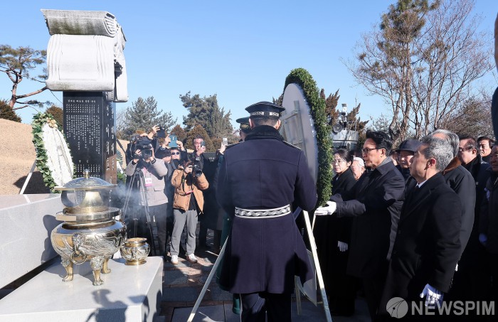 [서울=뉴스핌] 최지환 기자 = 김민석 국무총리가 6일 오전 서울 동작구 국립서울현충원 김대중 대통령 묘소에서 열린 김대중 재단 신년 하례식에서 헌화하고 있다. 2026.01.06 choipix16@newspim.com