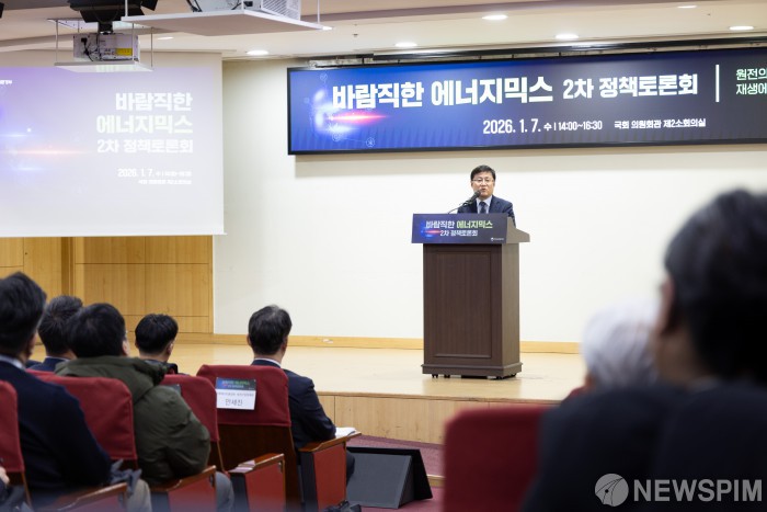 [서울=뉴스핌] 김성환 기후에너지환경부 장관이 7일 서울 여의도 국회 의원회관에서 열린 바람직한 에너지믹스 2차 정책토론회에서 인사말을 하고 있다. [사진=기후에너지환경부] 2026.01.07 photo@newspim.com