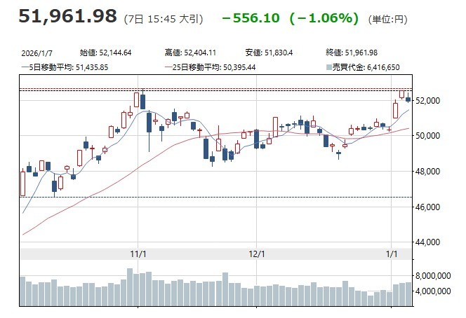 이날 닛케이225평균주가지수는 전일 종가보다 1.06%(556.10엔) 하락한 5만1961.98엔에 거래를 마쳤다. 도쿄증권거래소주가지수(TOPIX, 토픽스)도 0.77%(27.10포인트) 내린 3511.34포인트로 3영업일 만에 반락했다.