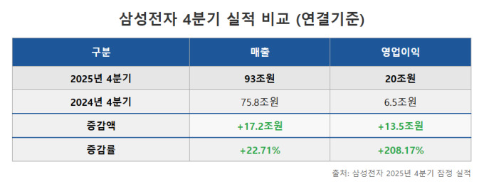 [서울=뉴스핌] 김정인 기자 = 삼성전자가 메모리 반도체 초호황에 힘입어 지난해 4분기 사상 처음으로 '분기 영업이익 20조 원 시대'를 열었다. 연간 매출도 332조 원을 넘어서며 3년 만에 역대 최대치를 경신하는 등 분기와 연간 실적 모두에서 새 기록을 썼다.