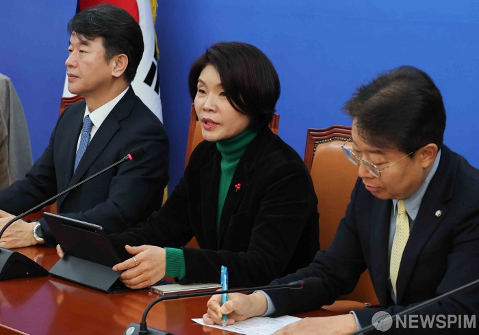 [서울=뉴스핌] 윤창빈 기자 = 한정애 더불어민주당 정책위의장이 8일 서울 여의도 국회에서 열린 정책조정회의에서 모두발언을 하고 있다. 2026.01.08 pangbin@newspim.com