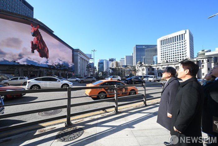 [서울=뉴스핌] 허민 국가유산청장(왼쪽)이 8일 오후 ‘말, 영원의 질주’전이 개최되는 서울 중구 신세계백화점 본점을 방문해 박주형 ㈜신세계 대표이사(왼쪽 두 번째) 등 관계자들과 함께 외벽 전광판(신세계스퀘어)에서 송출되는 말 영상을 살펴보고 있다. [사진=국가유산청] 2026.01.08 photo@newspim.com