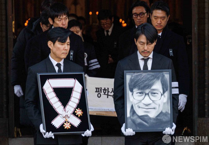 [서울=뉴스핌] 윤창빈 기자 = 배우 고(故) 안성기의 영결식이 엄수된 9일 서울 중구 명동성당에서 장례미사를 마친 고인의 운구 행렬이 나오고 있다. 2026.01.09 pangbin@newspim.com