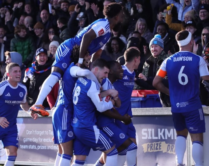 [서울=뉴스핌] 박상욱 기자 = 매클스필드 선수들이 10일(한국시간) 2025-2026시즌 잉글랜드축구협회(FA)컵 3라운드 홈 경기에서 골을 넣고 기뻐하고 있다. [사진=매클스필드 FC SNS] 2026.01.11 psoq1337@newspim.com