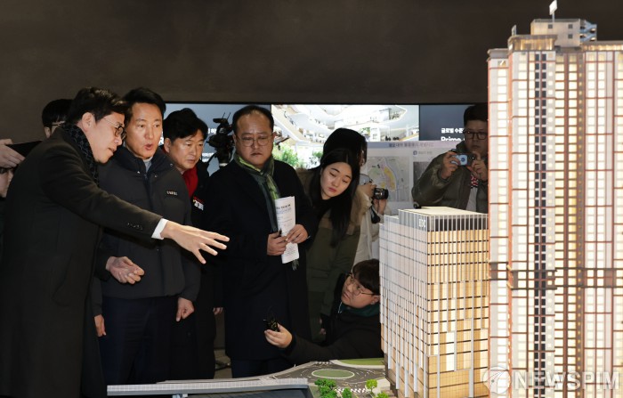 [서울=뉴스핌] 양윤모 기자 = 오세훈 서울시장이 12일 오후 노원구 월계동 광운대역 물류부지 공사현장을 찾아 HDC현대산업개발이 시공중인 'SEOUL ONE' 현장을 시찰을 하고 있다. 40여년 간 물류시설, 시멘트 저장고가 있던 광운대역 일대 15만 6,581㎡에 상업·주거·업무시설, 생활SOC 등을 조성하는 ‘광운대역 물류부지 개발 사업’은 복합용지 주택 건설을 시작으로 오는 '28년 준공을 목표로 추진된다. 2026.01.12 yym58@newspim.com