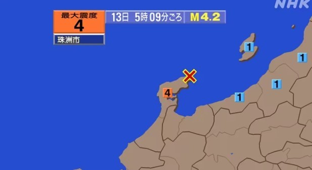 NHK에 따르면 13일 오전 5시 9분경, 이시카와현 노토 지방을 진원으로 하는 규모 4.2의 지진이 발생했다. 이번 지진으로 이시카와현 일부 지역에서는 최대 진도 4의 흔들림이 관측됐다.