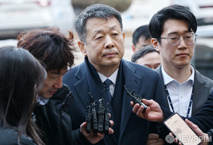 [서울=뉴스핌] 정일구 기자 = '홈플러스 사태'와 관련 사기 혐의를 받는 김광일 MBK파트너스 부회장 겸 홈플러스 공동대표가 13일 오전 서울 서초구 서울중앙지방법원에서 열린 구속 전 피의자 심문(영장실질심사)에 출석하고 있다. 2026.01.13 mironj19@newspim.com