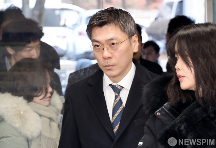 [서울=뉴스핌] 정일구 기자 = '홈플러스 사태'와 관련 사기 혐의를 받는 김정환 MBK파트너스 부사장이 13일 오전 서울 서초구 서울중앙지방법원에서 열린 구속 전 피의자 심문(영장실질심사)에 출석하고 있다. 2026.01.13 mironj19@newspim.com