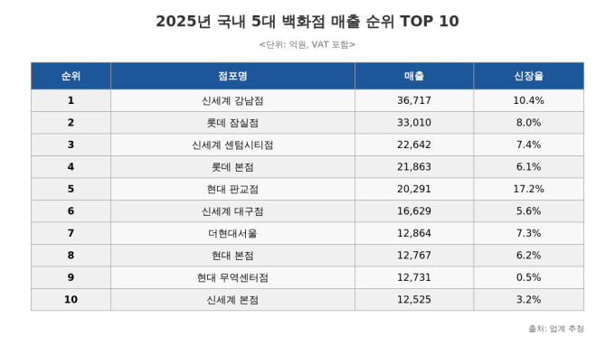 신세계백화점 강남점은 지난해 매출이 3조6717억원으로 전년 대비 10.4% 신장했고, 롯데백화점 잠실점은 8.0% 늘어난 3조3010억원을 기록했다. 두 점포는 명품 브랜드 확대와 고소득 상권 기반의 안정적인 수요를 바탕으로 독보적인 매출 규모를 유지했다.