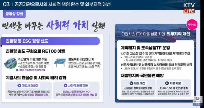 김윤덕 국토교통부 장관은 이날 업무보고에서 "노후 열차 교체 사업에 심각한 문제가 드러났다"며 "국민께 사과해야 할 사안"이라고 지적했다. 정 직무대행은 "신차 서비스 지연과 안전 저하 우려에 대해 통렬히 반성하고 있다"며 "국토부와 함께 국민 불편을 최소화하겠다"고 말했다.