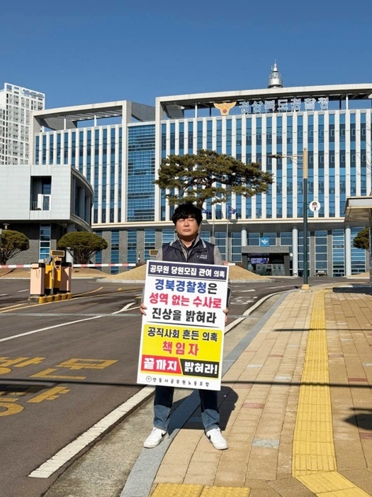 경북 안동시 공무원노조위원장이 '공무원 당원 모집 관여' 의혹 관련해 경북경찰청 앞에서 '성역 없는 수사'를 촉구하는 1인 시위를 벌이고 있다.[사진=안동시공무원노조] 2026.01.14 nulcheon@newspim.com