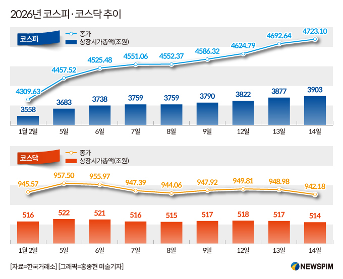 시장 규모에서도 양극화는 뚜렷하다. 코스피 상장 시가총액은 지난 2일 3558조원에서 14일 3903조원으로 300조원 이상 늘어났으나, 코스닥 시가총액은 같은 기간 516조원에서 514조원으로 오히려 감소했다. 지수 상승이 실질적 자금 유입으로 이어진 코스피와 달리 코스닥은 자금 이탈 압박에서 벗어나지 못한 모습이다.
