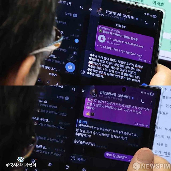 윤창빈 기자는 지난해 12월 2일 국회 본회의장에서 문진석 더불어민주당 원내수석부대표가 당시 김남국 대통령실 소통비서관에게 텔레그램으로 인사청탁을 하는 순간을 포착했다.