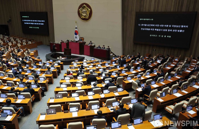 [서울=뉴스핌] 윤창빈 기자 = 15일 서울 여의도 국회에서 열린 본회의에서 윤석열ㆍ김건희에 의한 내란ㆍ외환 및 국정농단 행위의 진상규명을 위한 특별검사 임명 등에 관한 법률안이 상정되고 있다. 2026.01.15 pangbin@newspim.com