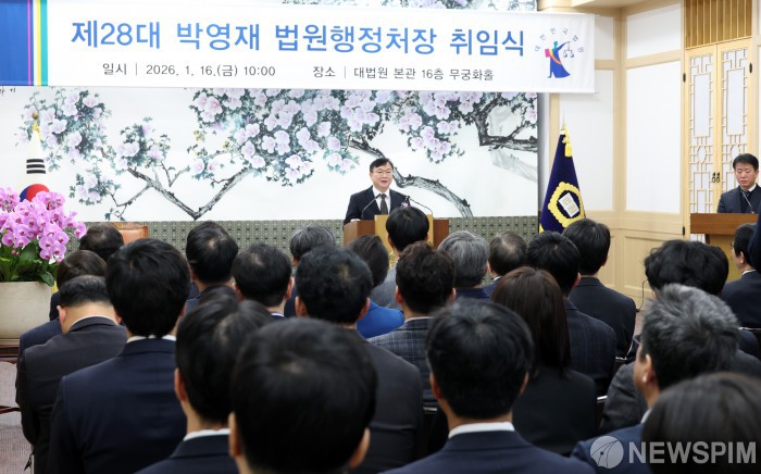 [서울=뉴스핌] 정일구 기자 = 박영재 신임 법원행정처장이 16일 오전 서울 서초구 대법원에서 열린 취임식에서 취임사를 하고 있다. 2026.01.16 mironj19@newspim.com