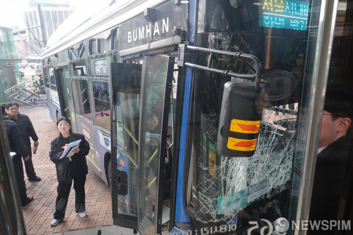 [서울=뉴스핌] 이길동 기자 =16일 오후 서울 서대문역 인근에서 시내버스가 인도와 건물로 돌진하는 사고가 발생해 경찰과 소방대원들이 현장을 수습하고 있다.2026.01.16 gdlee@newspim.com