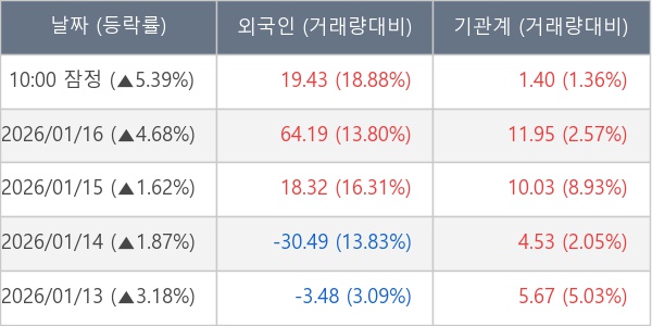 [서울=뉴스핌] 로보뉴스 = 19일 10시 15분 현재 LG전자(066570)는 전일 대비 5.39% (현재가 103,700원) 상승했고, 기관이 최근 5일 연속 순매수(누적 33.57만 주, 잠정) 행진을 하고 있다.