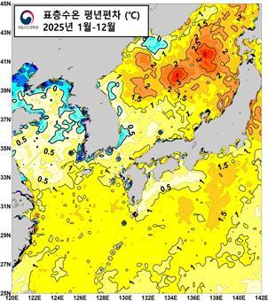 동아시아 바다의 월별 수온은 1~5월 2001~2020년 평균 수준이었으나, 6~10월 평균 26.44℃로 역대 최고 기록을 세웠다. 수과원의 배타적 경제수역(EEZ) 장기 관측에 따르면 2025년 하반기(8~12월) 표층 수온은 21.27℃로 2024년(22.28℃) 다음으로 높았다.