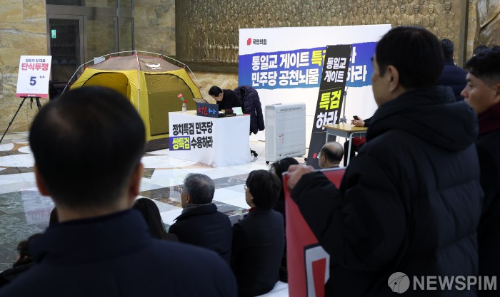 [서울=뉴스핌] 정일구 기자 = 장동혁 국민의힘 대표가 19일 오전 서울 여의도 국회 로텐더홀에서 더불어민주당의 통일교·공천뇌물 '쌍특검' 수용을 촉구하며 닷새째 단식 농성을 이어가고 있다. 2026.01.19 mironj19@newspim.com